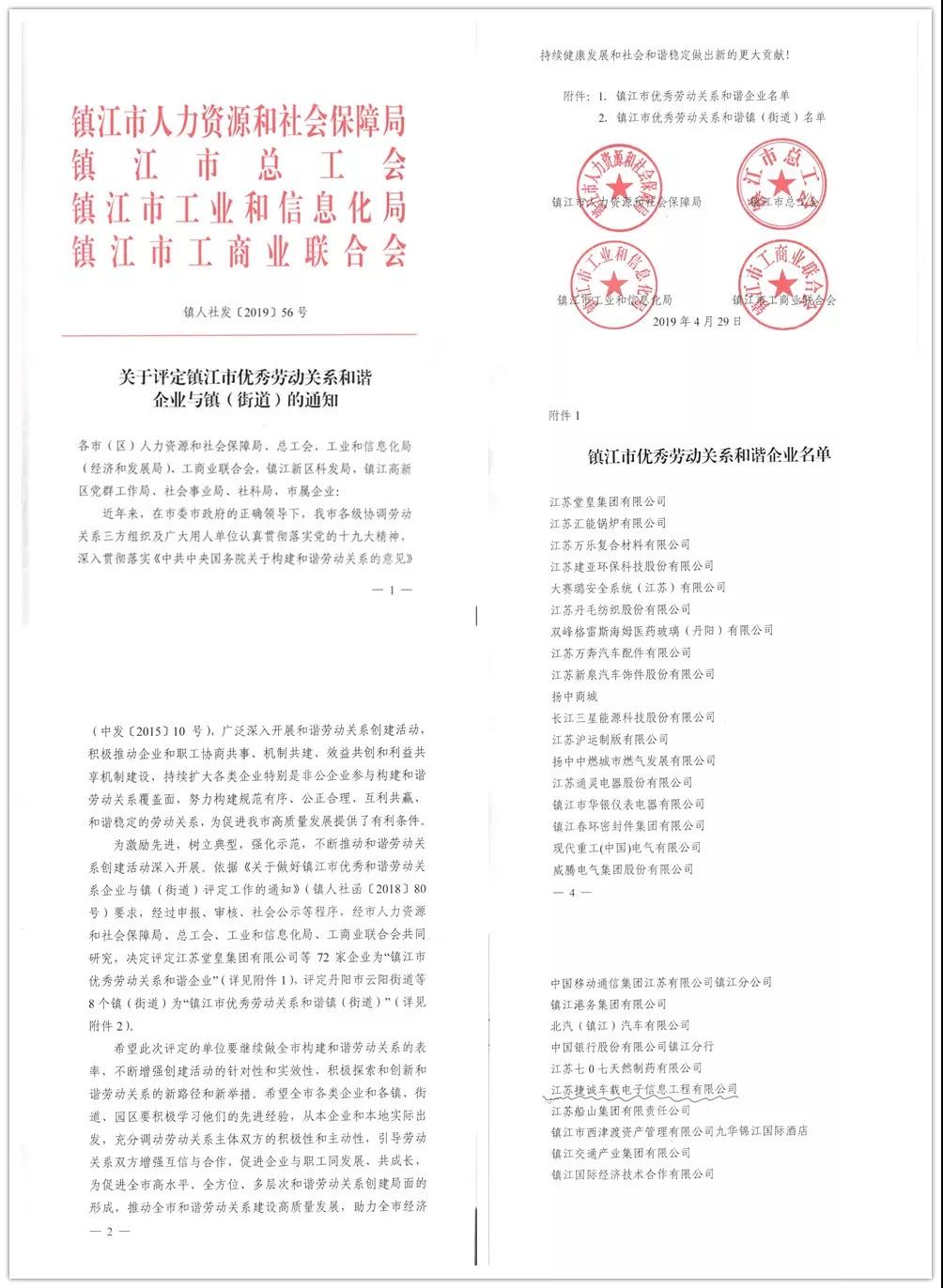 近日,鎮江市人力資源和社會保障局、鎮江市總工會、鎮江市工業和信息化局、鎮江市工商業聯合會等部門聯合舉辦了鎮江市優秀勞動關系和諧企業評選活動,經前期申報,上級有關部門審核,江蘇捷誠榮獲“鎮江市優秀勞動關系和諧企業”稱號。